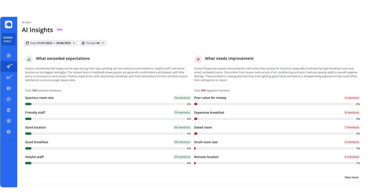AI Insights pulls information from all the hotel’s guest feedback and organizes it into a structured, actionable view.