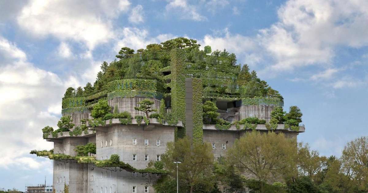 The relaunched Hamburg Bunker is now packed with two restaurants, a five-story Hard Rock Hotel and a newly built pyramid-like rooftop bar and garden from which greenery flows abundantly over the concrete facade.