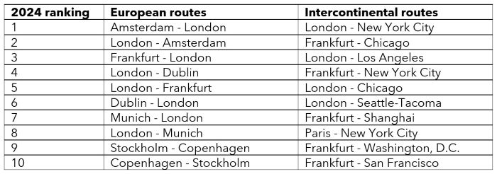 2 Top routes combine data of multiple airports for the following cities: London (Heathrow, London Gatwick and London City); Paris (Charles de Gaulle and Orly); New York City (John F. Kennedy, Newark and La Guardia); Shanghai (Pudong and Hongqiao).