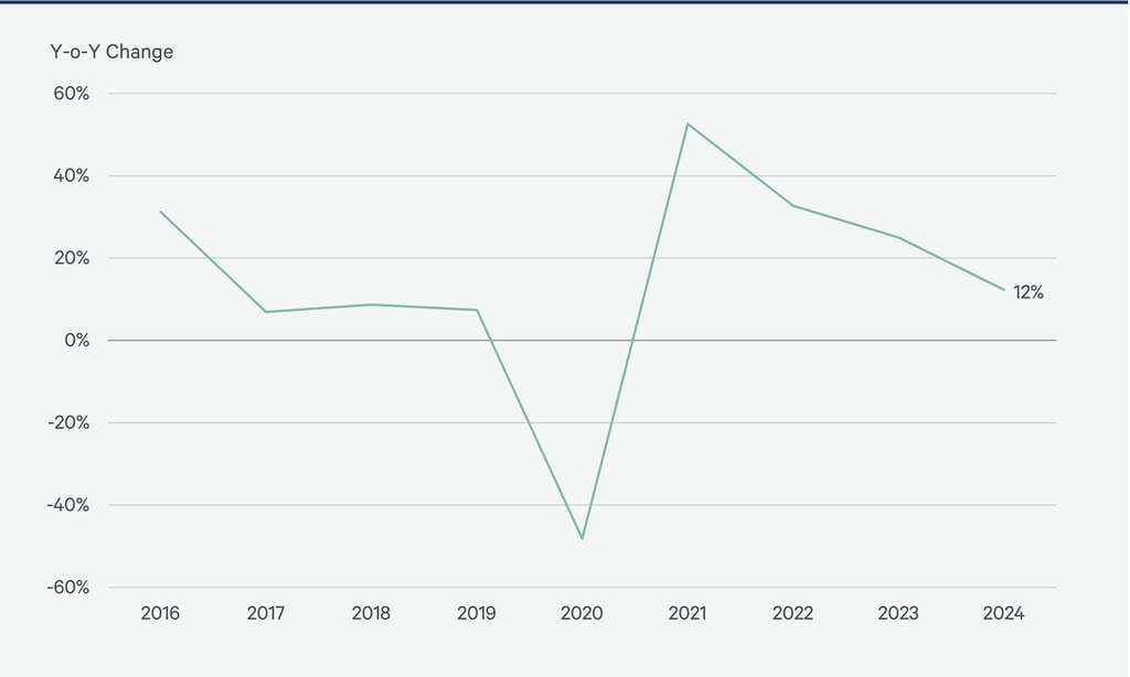 - A record 21 brand launches and partnerships in 2024 attracted new guests and a variety of new use cases, driving loyalty program membership and hotel occupancy. Membership surged 14.5% in 2024, outpacing room growth and pushing members per room up by 7.4%.