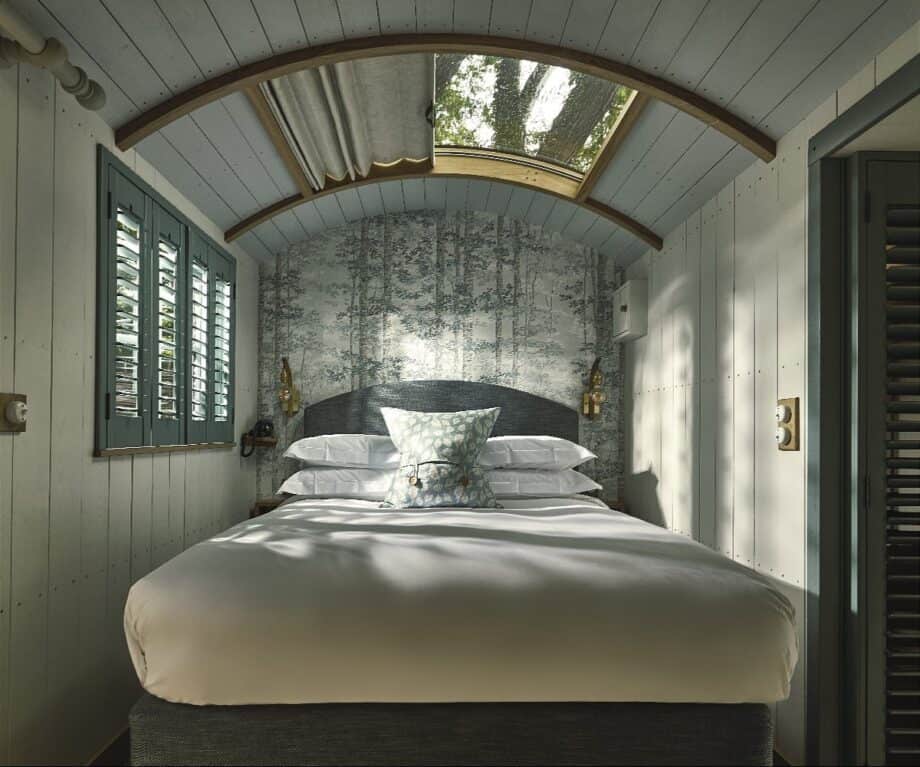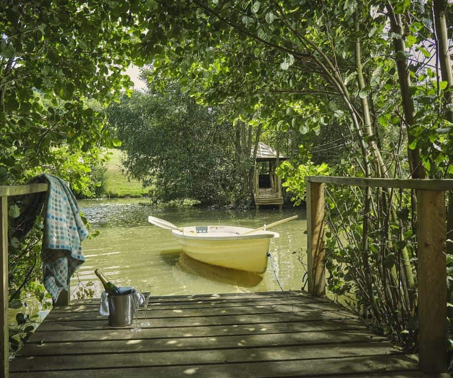 One hut, Boaty McBoatface, slips away from the Shakespearean theme. This hut, overlooking a pond, has its own boat for a romantic two-minute row across to a tiny island.